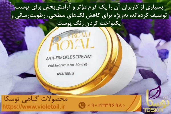 زمانی که اقدام به خرید کرم ژل رویال آواطب اصفهان کردید پیری پوست را به تعویق خواهید انداخت. علت تعویق پیری سلولها ژل رویال موجود در این محصول حاوی آنتی اکسیدان است. آنتی اکسیدانهایی مانند ویتامین سی یا فلانوییدها کاملا طبیعی در رویال وجود دارد  و با مصرف این کرم در مدت زمان کوتاهی اثرات آن را بر روی پوست خواهید دید. اگر زخمی تازه یا کهنه روی پوست داشته باشید در دو حالت کرم ژل رویال این اثر را از بین خواهد برد. این کرم ضد التهاب است و حتی درد را نیز تسکین می دهد. به راحتی و در مدت زمان کوتاهی تاثیر از بین رفتن جای زخم را مشاهده خواهید نمود آبرسانی پوست یکی از مزیت‌های مهم کرم ژل رویال آواطب اصفهان است که با پروتئین و قند طبیعی پوست را تغذیه می‌کند و رطوبت را در پوست نگه می دارد.