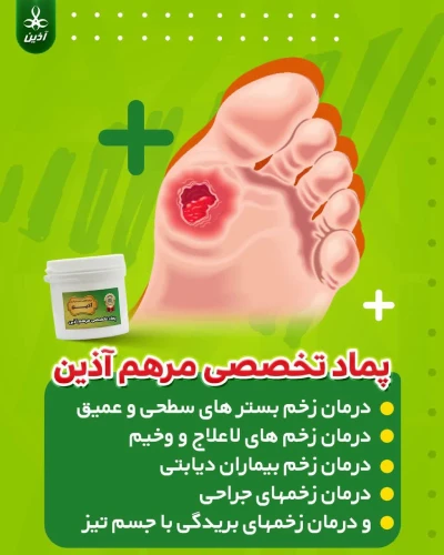 - بهبود زخم بیماران دیابتی: یکی از خطرناک ترین پیامدهای بیماری قند، پدید آمدن زخم هایی است که به دلیل گردش خون ناکافی، به دشواری بهبود می یابند. پماد مرهم آذین با ویژگی ضد آلودگی نیرومند و توانایی برانگیختن سامانه ایمنی بدن، به بهبود این زخم های بهبود ناپذیر و شدید کمک بزرگی می کند.